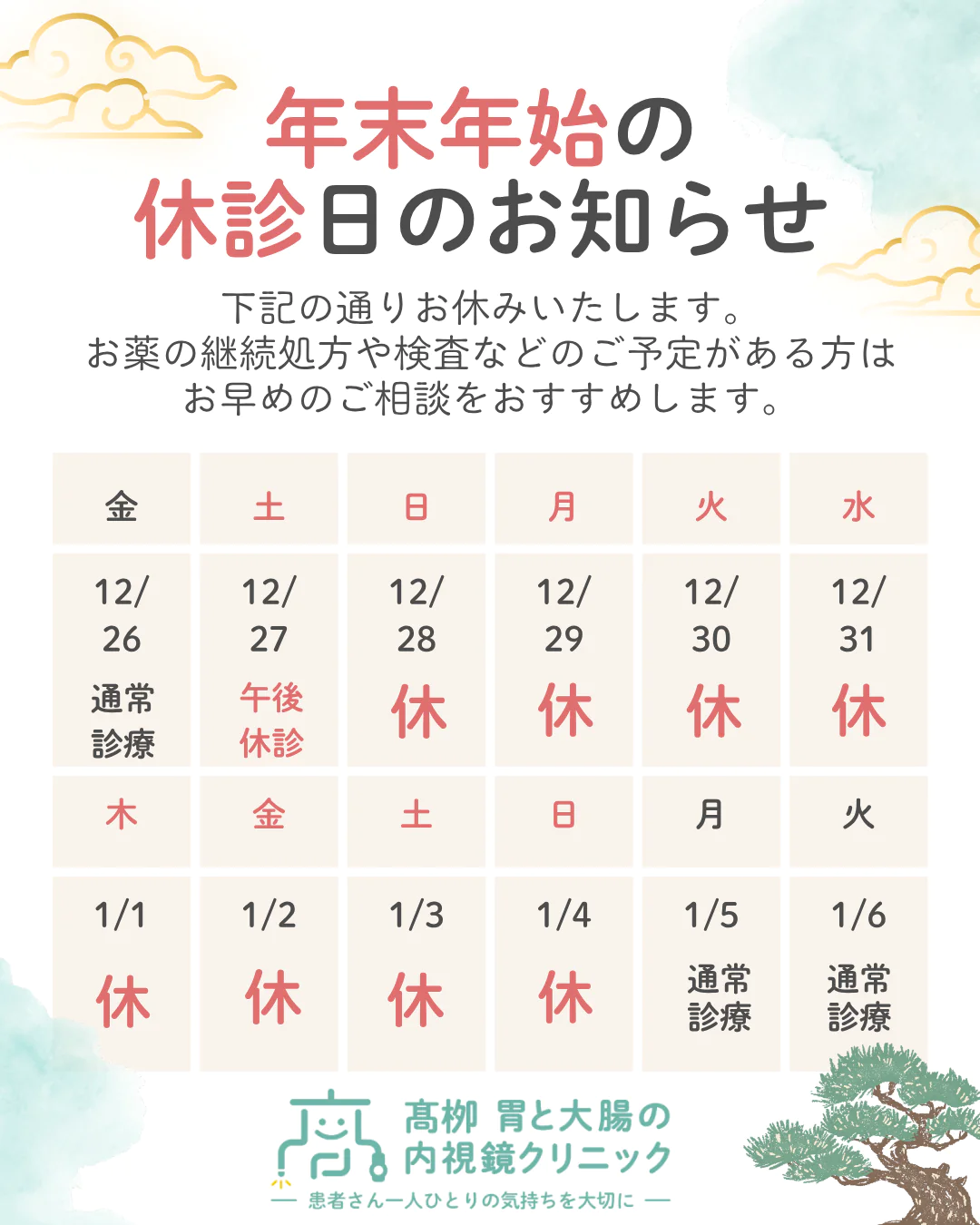 年末年始のお知らせ event_note2025.11.26 少し早いですが、年末年始の休診についてお知らせです。 12月27日午後〜1月4日が休診となります。 今年も一年ありがとうございました! 休診前後は混み合う場合がございますので、 ご受診を希望される方はお早めの来院をおすすめいたします 新年の診療は1月5日からスタートします どうぞよろしくお願いいたします。
